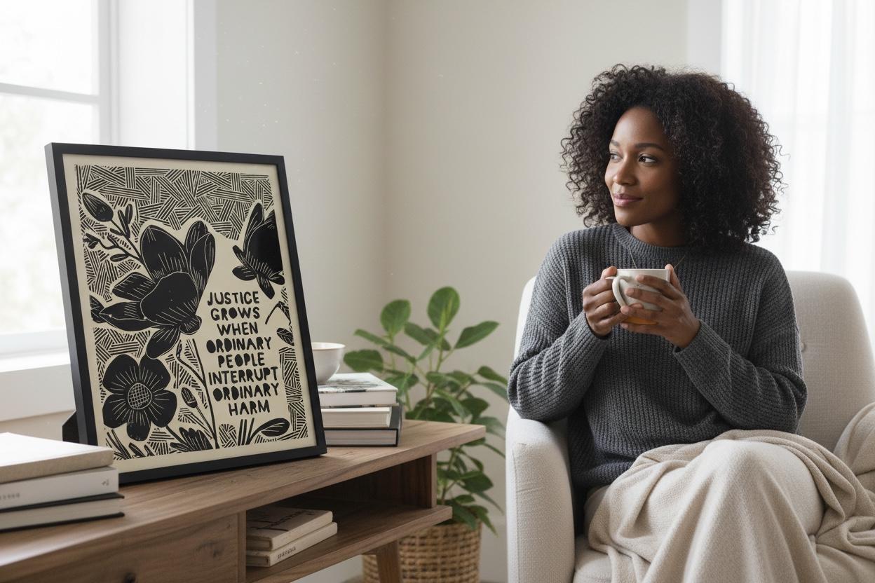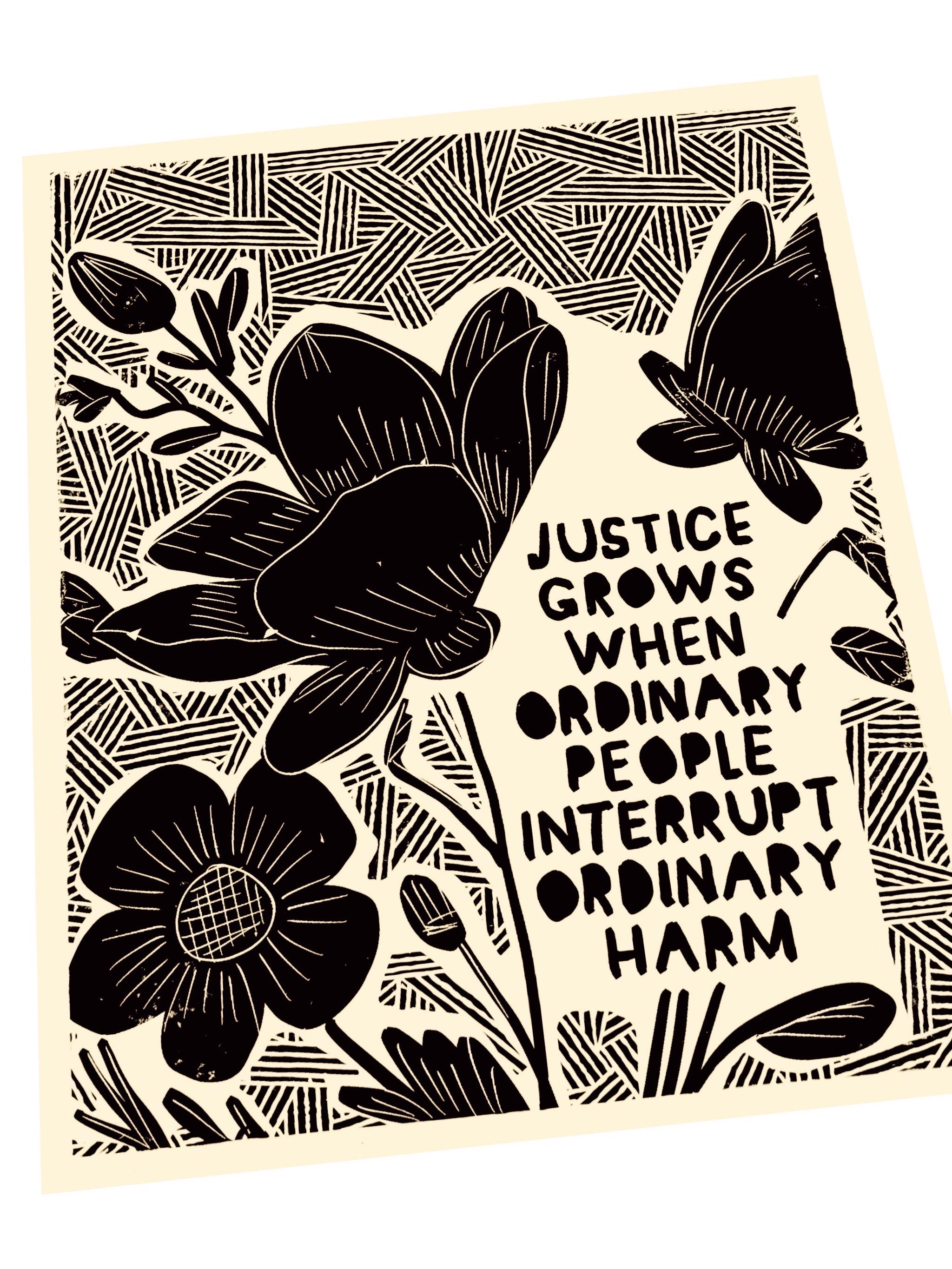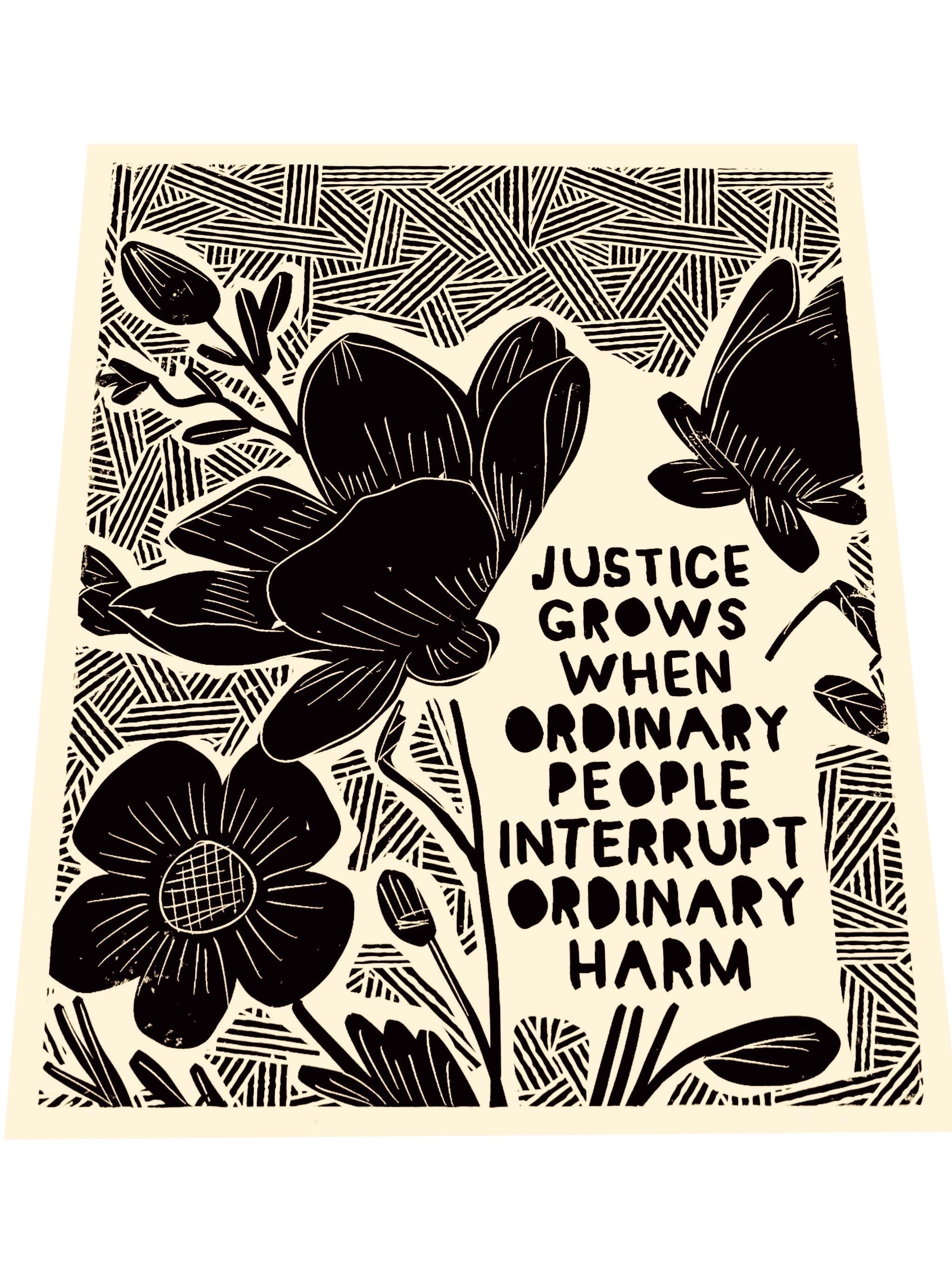 Justice grows when we interrupt harm, art for change, feminist, feminism, floral art, handmade justice block print relief print, poster