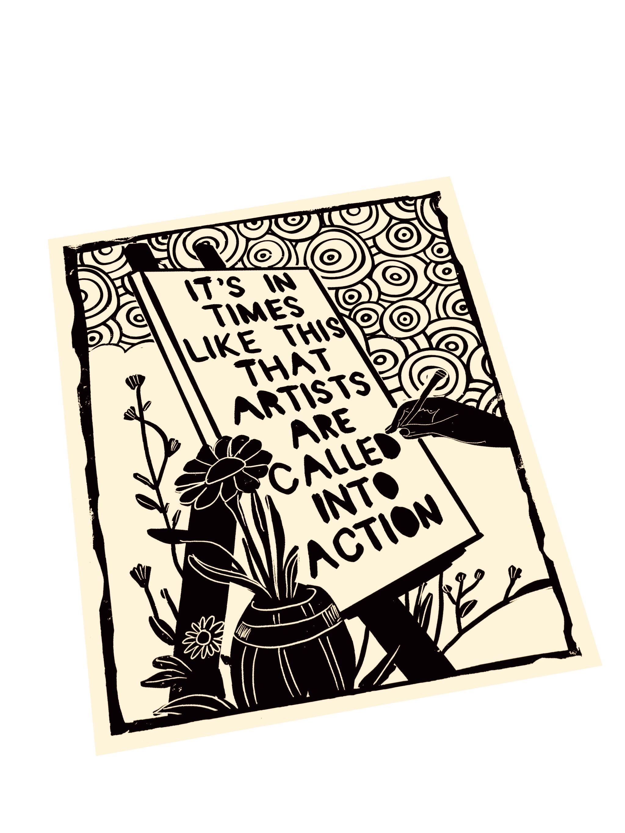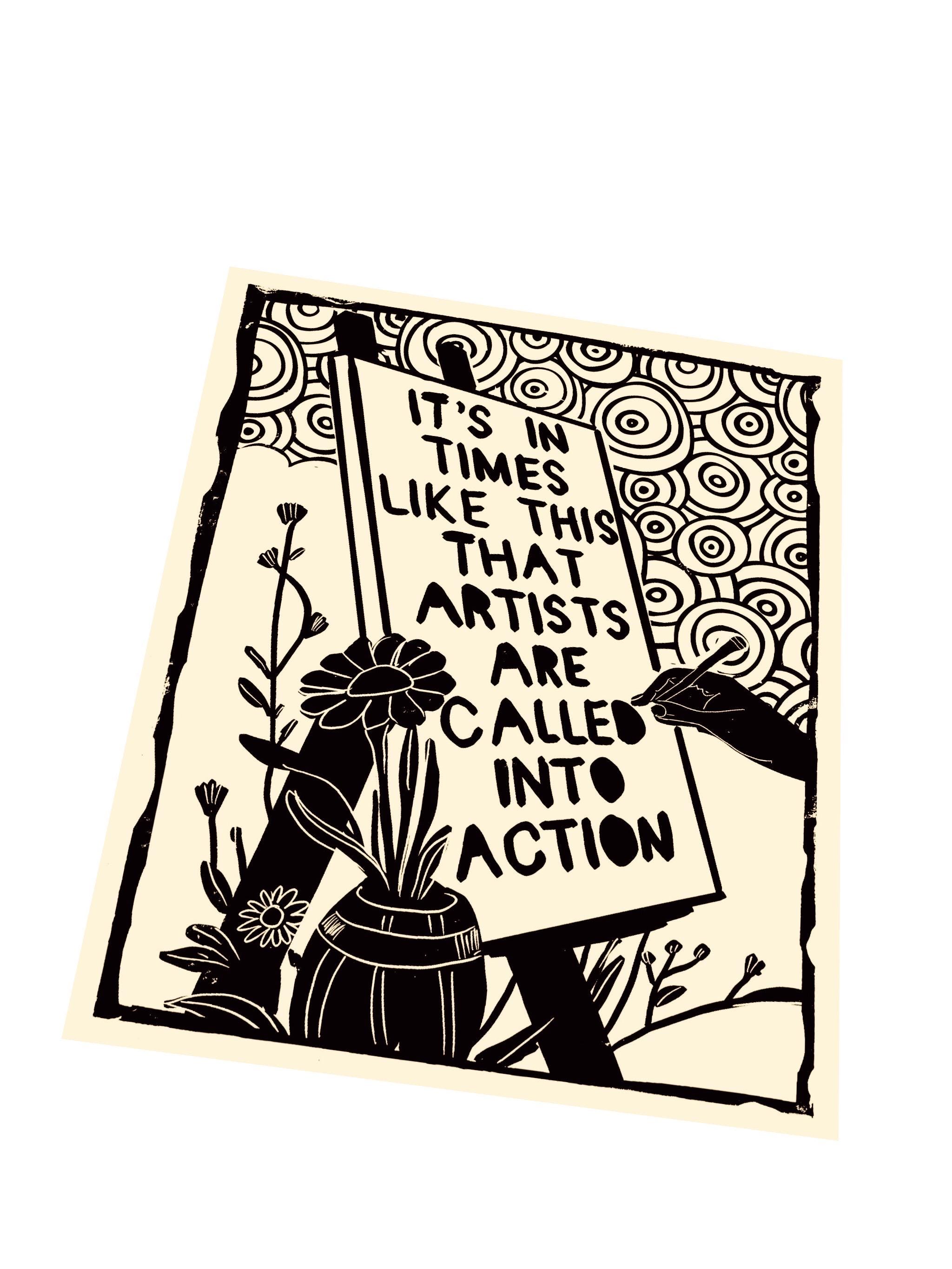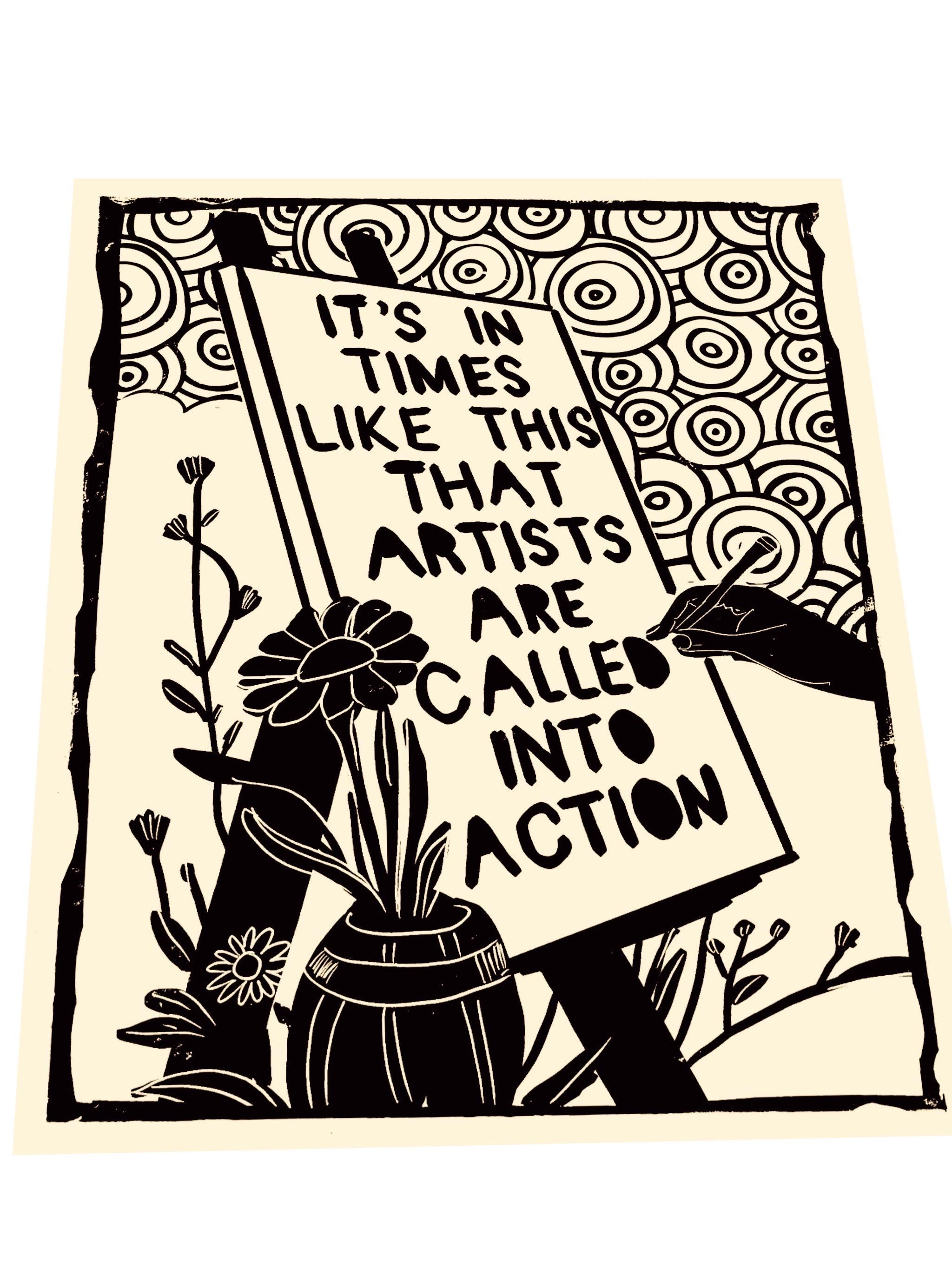 Call to artists, Don't stop making art, Creativity takes courage. Lino style illustration, art activism. block style print, together